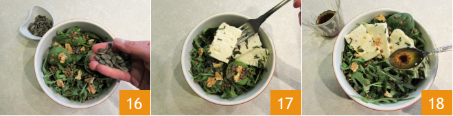 and emulsify everything with a fork 13. Move on to the composition. In a bowl, pour the baby spinach and arugula 14, garnish with some lentils 15,