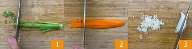 To make the lentils in a pressure cooker, first prepare the vegetables for the soffritto: clean and finely chop the celery 1, carrot 2, and onion 3.