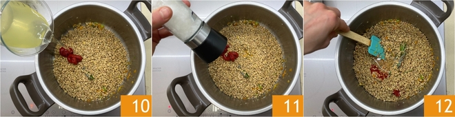 Finally, pour in the broth 10, salt 11, and pepper, then mix everything well 12.