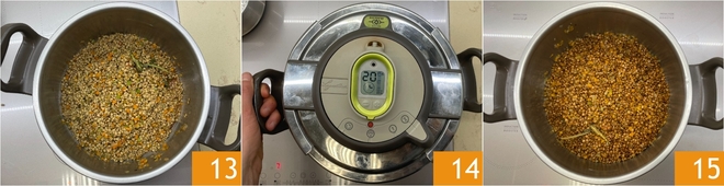 At this point 13 close the pot with the lid and close the valve 14, raise the flame and wait for it to come to pressure. As soon as you hear the whistle, lower the flame again and cook for half the time indicated on the lentil package: we cooked them for 34 minutes. Once the cooking time is over, turn off the heat and lift the valve to release all the steam (always be careful not to burn yourself). Only then can you open the lid. Adjust the salt and serve your pressure cooker lentils as you prefer 15!