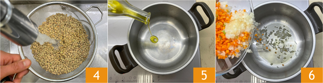 Rinse the lentils under running water 4. Place a 4.5-liter capacity pressure cooker on the heat, pour a drizzle of oil 5 and the vegetables 6.