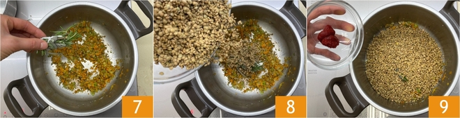 Sauté the soffritto for about 5 minutes, then add the sage and rosemary tied together with kitchen twine 7. Add the lentils 8 and tomato paste 9.