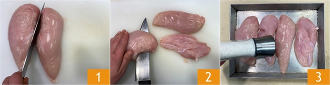 To prepare the light chicken salad, divide the breast in two 1, then cut two slices from each 2. Arrange the fillets on a baking tray, season with salt and pepper 3.