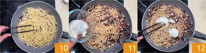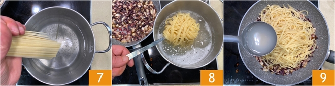 Cook the linguine in plenty of salted water 7 and drain it al dente 8, reserving some cooking water. Transfer the pasta to the pan with the radicchio and add a ladle of cooking water 9.