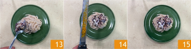 Sauté everything 10, then add the ricotta 11 and mix well 12. You should obtain a smooth and homogeneous cream; if necessary, add a bit more pasta cooking water.