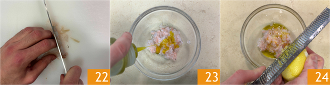 Finely chop the scampi flesh 22, place it in a small bowl, and add a drizzle of oil 23 and grated lemon zest 34.