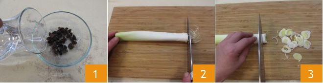 To prepare the liver with balsamic vinegar, pine nuts, and raisins, start by pouring cold water into a bowl with the raisins, letting them soak to rehydrate 1 for at least 30 minutes. Then move on to preparing the sauce: take the leek and remove the ends 2. Then cut it into thin rings 3.