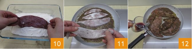 Flour the slices of liver 10 and heat them in the pan with the sauce 11. Sear them for 4 minutes, then turn the slices over and cook them on the other side for an additional 4 minutes. Then deglaze with the red wine 12: let it evaporate.