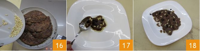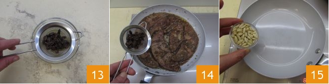 Now drain the raisins 13 and add them to the meat 14. Season with salt and pepper. In another pan, toast the pine nuts 15.