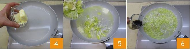 In a wide-bottomed non-stick pan, melt the butter over low heat 4. Once completely melted, add the leek 5. Let it cook for about 7-8 minutes before adding the balsamic vinegar 6.