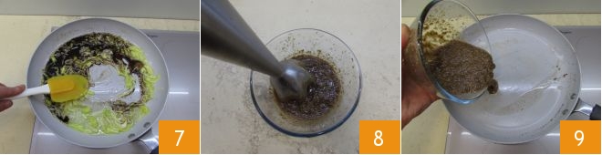 Mix the ingredients well 7 while letting the vinegar evaporate: this will take 2-3 minutes. Once completely evaporated, transfer the ingredients to a high-sided container and blend them with an immersion mixer 8: you need to obtain a smooth cream, which you will pour back into the pan where you cooked the leek 9.