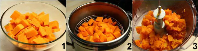 Clean the pumpkin by removing the skin and seeds; cut it into cubes 1 and weigh 600 grams (about 1 lb 5 oz); transfer it to the steamer basket 2 and cook in a pressure cooker for about 5-7 minutes from when you hear the pressure whistle; turn off and leave the pot covered until it is warm, then open it; take out the pumpkin flesh, lightly strain it in a colander, and then put it in the mixer bowl 3;