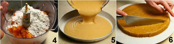 add the eggs and flour 4 sifted with powdered sugar and start mixing; then gradually add the cream and honey, finally the cinnamon and nutmeg; you should obtain a fairly liquid mixture but without lumps. Butter and flour a 9-inch round pan and pour the mixture in 5.