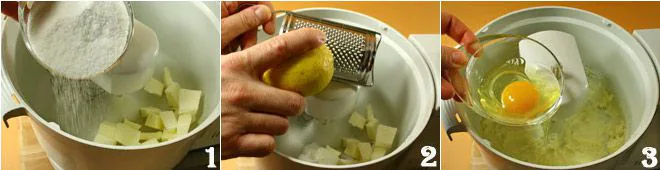 Cut the butter into cubes and, using the beaters of a mixer or a food processor, mix it with the sugar 1 and grated lemon zest 2 until you get a nice smooth cream.