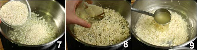 In a sufficiently large saucepan, put the rest of the oil, the butter, and ½ chopped onion, then let it brown and add the rice 7, which you will toast. Wet the rice with white wine 8 and let it evaporate over high heat; then gradually add the fish broth 9 until fully cooked.