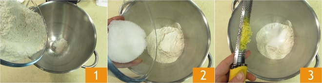 To prepare the Luna-Park fritters, start with the dough. First, pour the flour 1, sugar 2, and grated lemon zest 3 into the bowl of a stand mixer.