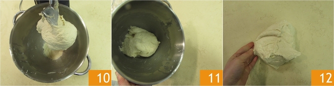 Wait for the dough to bond again with the hook 10, then gently remove it with your hands and transfer it to a surface 11 12.