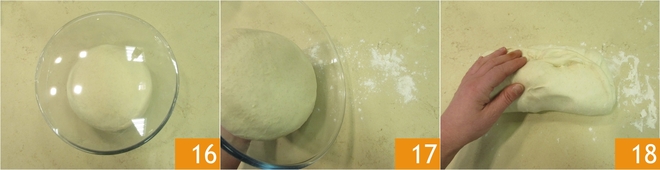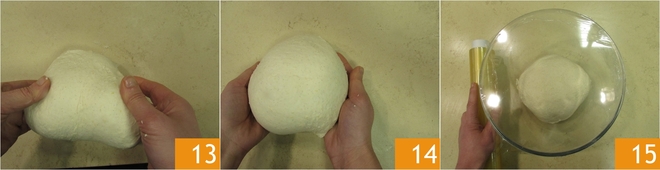 At this point, give the dough a slap & fold: lift it gently and fold it back over itself while stretching it 13. Then slide your hands underneath and round it, obtaining a spherical shape 14. Transfer into a bowl, cover with plastic wrap 15.
