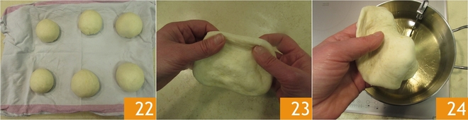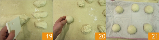 Using a dough cutter, cut pieces weighing about 95g 19. Shape them into balls 20 and place them on a tray lined with a cloth 21.