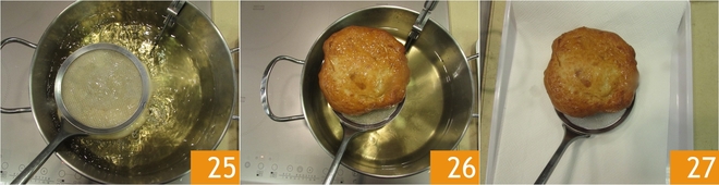 The fritter should turn golden slowly, use a skimmer to keep it submerged in the oil and to flip it 25. When it is well golden, drain it 26 and place it on a tray with paper towels. Remove just the excess oil 27.
