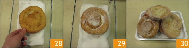 Then pass it, still hot, in the sugar 28, on both sides 29. Continue cooking the Luna-park fritters in this way and serve them while they are still warm 30.