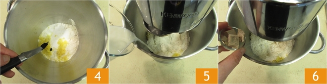 Also add the vanilla bean seeds 4. Start mixing with the hook attachment and pour in part of the milk 5. Add the crumbled yeast 6.