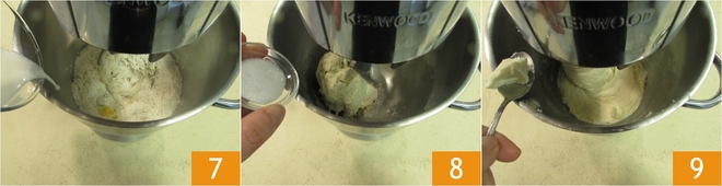 Then add the remaining milk 7. Mix for a few minutes, then add the salt 8 and wait for it to be fully absorbed. When the dough is well-bonded, add the butter. This step is crucial, add a piece at a time 9, waiting for it to be fully absorbed before adding more 9.