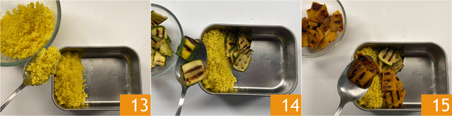 You are ready to transfer the ingredients to your lunch box: couscous on one side 14, then zucchini 15 and bell peppers 15.