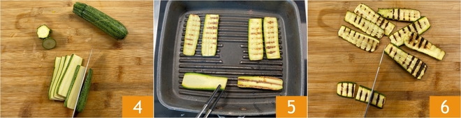 Trim the zucchini and slice them about 1/4 inch thick 4. Grill the zucchini as well 5 and cut them into pieces the same size as the bell pepper 6.