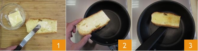 To prepare the madame club sandwich, start by spreading butter on 6 slices of bread about 5/8 inch thick 1. Transfer them to a hot nonstick skillet and toast them for a couple of minutes 2, turning halfway through cooking 3.