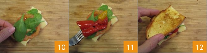 baby spinach leaves 10 and roasted peppers in oil 11. Close with the second slice of bread 12