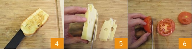 Set them aside 4 and move on to the rest of the preparations. Thinly slice the cheese 5 and then the tomato 6.