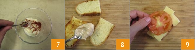 Pour the mayonnaise into a bowl and flavor it with smoked paprika 7, then mix well and spread it on the toasted slices 8. Assemble the first layer by placing a few slices of cheese and tomato 9,
