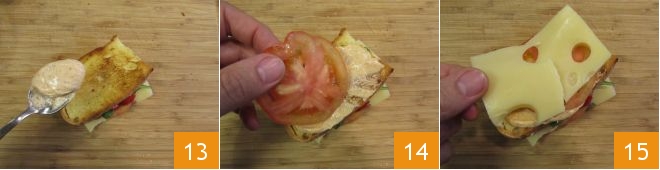 and compose the second layer with mayonnaise 13, tomatoes 14, cheese 15,