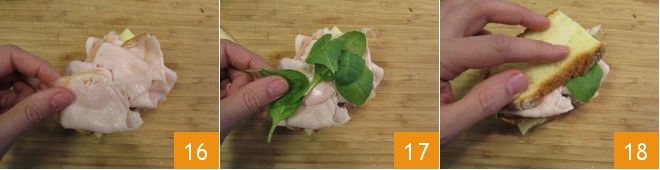 slices of turkey 16 and finish with baby spinach leaves 17. Finally close with the last slice of bread 18.