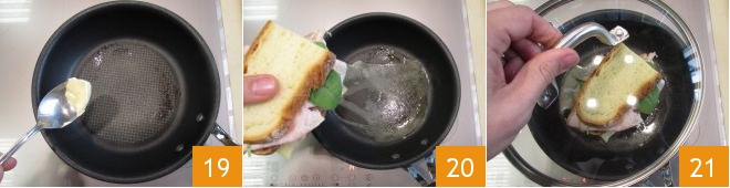 Melt a pat of butter (about 1 tbsp) in a nonstick skillet over medium-low heat 19 and when the bottom is sufficiently hot add the sandwiches 20. Toast them for about 3 minutes on one side, keeping them covered with a lid 21,