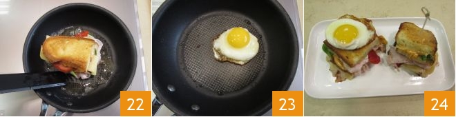 halfway through cooking flip them and continue for another 2 minutes, still covered 22. When the sandwiches are ready, set them aside and, in the same lightly greased skillet, cook the eggs for a couple of minutes 23. Cut the two sandwiches in half and place your fried eggs on the two halves of your madame club sandwiches and they're ready to enjoy: enjoy your meal 34!