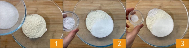 To prepare the madeleines, first melt the butter and let it cool slightly. In a bowl, pour in the flour and sugar 1, the baking powder 2, and the salt 3.