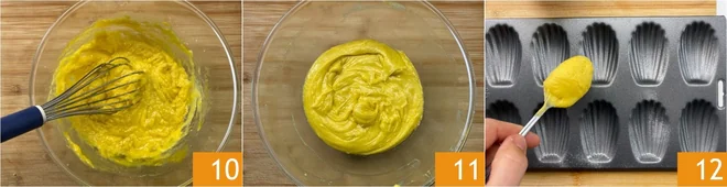 When you have obtained a smooth consistency 10, let the batter rest in the fridge for at least an hour 11, covered with plastic wrap. After this time, butter a madeleine mold and fill each cavity with half a tablespoon of batter 12, using another spoon to help it slide in.