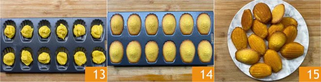 Do not overfill the molds; otherwise, the batter will overflow during baking 13. Bake in a preheated static oven at 392°F for about 13 minutes. Once golden, remove from the oven 14 and invert the mold to release the madeleines. Let cool slightly and serve 15!