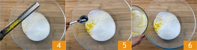 Flavor with grated lemon zest 4 and bitter almond essence 5, then add the cooled melted butter 6.