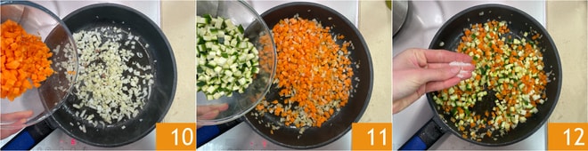 In the same pan, pour in the oil, then add the onion, carrots 10, and zucchini 11. Season with salt 12 and cook over medium-high heat for about 5 minutes.