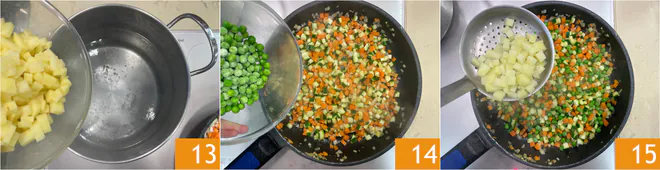 Meanwhile, boil the potatoes in water for 5 minutes 13. Add the peas 14 and potatoes 15 to the pan.