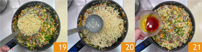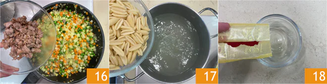Also, add the sausage 16 and cook over high heat for a few minutes. Meanwhile, cook the malloreddus in plenty of salted boiling water 17 and dissolve the saffron in a small bowl with some warm water 18.