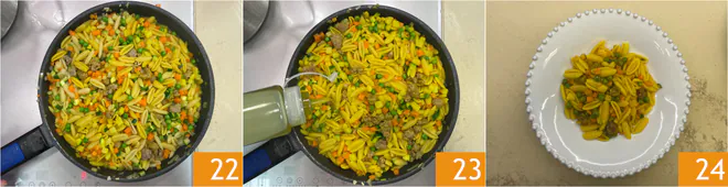 Stir 22 and finish cooking the pasta. Turn off the heat and toss with the oil 23, then adjust salt if necessary. The malloreddus with vegetables, sausage, and saffron are ready to be served 34!