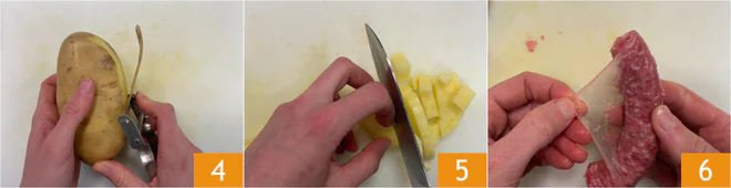 Peel the potatoes 4 and cut them into 1/4 inch cubes as well 5. Remove the sausage casing 6.