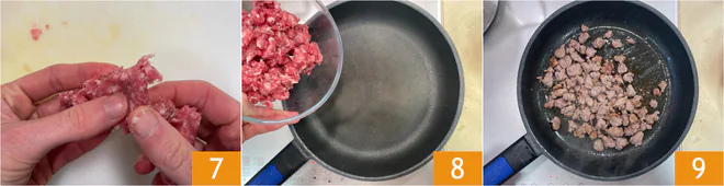 Crumble the sausage with your hands 7, place it in a non-stick pan 8, and brown for a few minutes over medium-high heat 9. Transfer the sausage to a bowl and set aside.