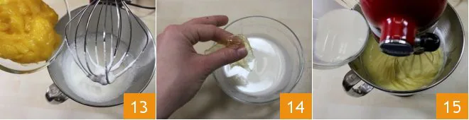 In a separate bowl, beat the egg yolks with the sugar until they become soft and light 7, add the cornstarch and juice of half a lemon 8, mix and finally add the mandarin juice 9.