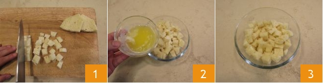To prepare the mantis shrimp cakes, start by slicing the white bread, remove the crust, and cut the crumb into cubes 1; then transfer it to a bowl and pour melted butter over it 2. Mix well and let it rest for at least 10 minutes 3.