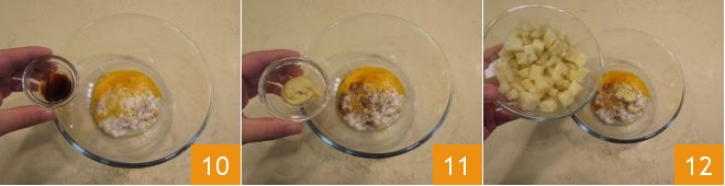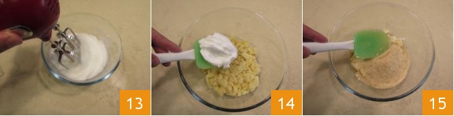 At this point, whip the egg whites until stiff 13 and gently fold them into the rest of the ingredients with a spatula 14, then add the breadcrumbs 15.